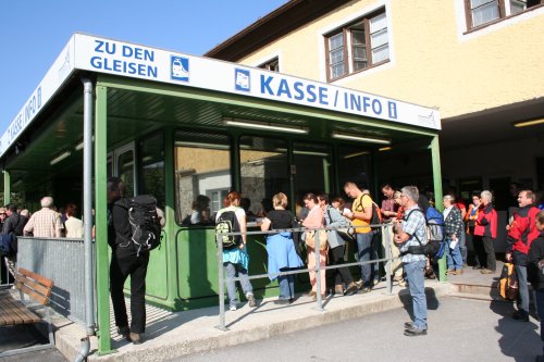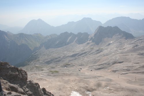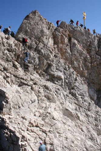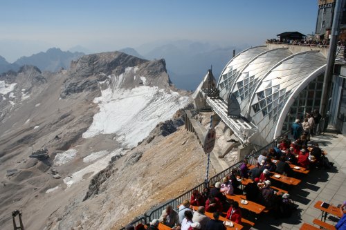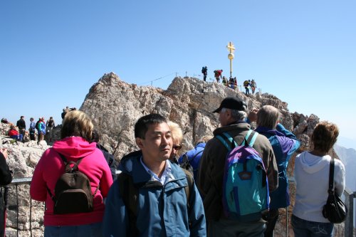 ガルミッシュ・パルテンキルヒェン駅から、登山鉄道に乗り換えて、ドイツ最高峰のツークシュピッツェを目指す。 といきなりトラブル。登山列車に乗るのに行列だ。登山列車は、1時間に1本しかない。乗れないと1時間待ち。それに入場制限しているのかホームに も入れてくれない。暑い日差しの中、結局1時間並ばされ待つことに。1本列車が多かったようだけど、結局乗りたかった列車の1時間遅れのものに乗る。そし たら、なんと車両は結構ガラガラで座れる席もたくさん残っている。だったら乗せてくれてもいいのにと思ったが、途中駅で乗ってくる人のためのようだ。途中 駅?あれっ?て思った。それは、ロイッテから来る時通った駅だった。ここで乗り換えれば、ガルミッシュ・パルテンキルヒェンで並ばずに1時間前の列車に乗 れたのだった。なるほど日本のガイドブックは、ミュンヘンから列車でくる際のルートしか掲載されていない。ミュンヘンからだと反対から来るのでこの途中駅 は通らない。失敗した。下調べが足りなかったなあ。フュッセンからわざわざオーストリアのロイッテにバスで行き、そこから列車というのは少数派だったの か。 なんとか次のポイントのロープウェイの駅に付く。いきなり日本語の看板がいっぱい。それもそのはず、このロープウェイ、日産がスポンサーみたい。結構日本人もくるのかね? 本当は、山歩きしたかったんだけどね。ロープウェイでドイツ最高峰ツークシュピッツェの頂上まであっという間だよ。 ロープウェイからは、アイプゼーという湖が綺麗に見えた。ところどころ珊瑚礁のようにエメラルド・グリーンだったのは、何故だろう。綺麗な湖だったなあ。 後ろが頂上。 贅沢な眺めのカフェタイム、至福の時間だね。 荒涼とした山の眺めも意外と好き。 山間の村は、これぞヨーロッパの景色だ。 頂上までは、ちょっとだけ崖登り。 |