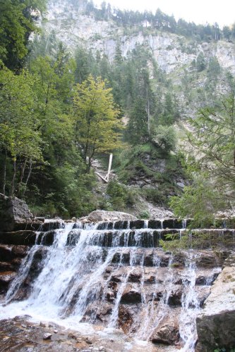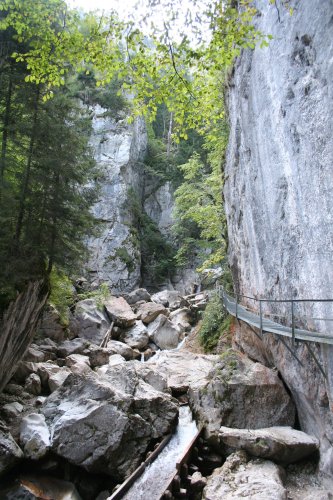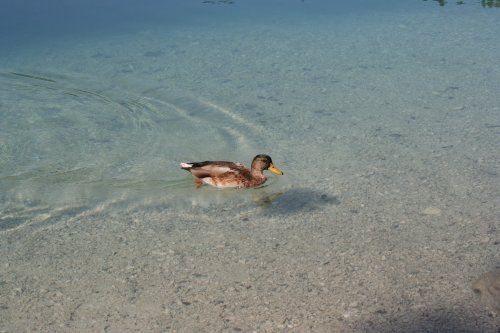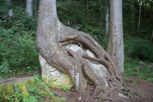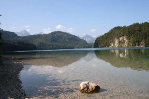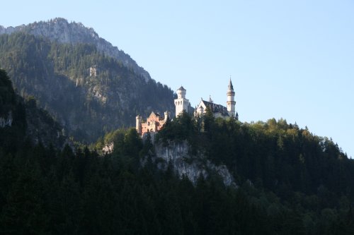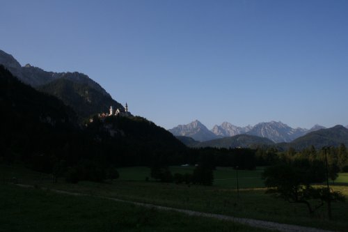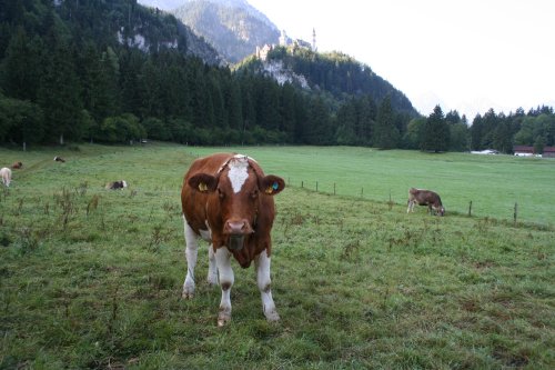 おお、遠くに朝陽にあたるノイシュヴァンシュタイン城が・・・。これ、写真じゃ伝わらないと思うけど、本当に綺麗だったよ。人工の建造物と自然が調和するってこういうことを言うんだな。 しばし、立ちすくんでしまう。 こちら側からだと、煉瓦の部分も見られてまた違った印象を受ける。 長閑な放牧地が広がっている。牛とか馬って何故か人間が来ると寄ってくるんだよねえ。カウベルの音がそこらじゅうに響いていた。 ハイキング・コースとの境にテープが張ってあるんだけど、思わずそこを触ったらビリビリって微弱な電流が通っていたよ。これで牛が逃げないんだね。 牛、微笑ましかった。 ハイキング・コースは、やがて山っぽい道に。 沢のある山道は、大好き。水の流れる音は、耳に心地よく。マイナス・イオンのシャワーを浴びるよう。 木に飲みこまれた大きな石。 城へは登らず、アルプゼーという湖へ。 水が綺麗。 |