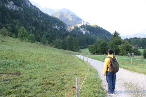 悪夢の翌日(大げさ)に、修復していない反対側のノイシュヴァンシュタイン城の姿を拝もうと早起きして、朝陽のあたる時間を目指して、テーゲルベルク山の麓へ。ここからノイシュヴァンシュタイン城の方へ伸びているハイキング・コースへ。