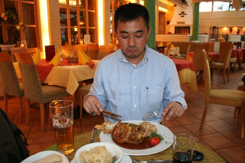 ビール。ミュンヘンでは飲まず、フュッセンに来てから飲んだ。(笑) でも、これミュンヘンのビールみたい。 鶏肉レバーの肉団子スープ。拳大の肉団子が一つスープの中に。こういうセンスが嫌。もっと食欲そそる盛り付けができないものか。 海老のパスタ。美味しかったけど量がすごい。 でた、ザワークラウト。これ苦手。でも食べてみたら日本で食べるのよりはるかに美味しかった。 でた、アイスバイン。メニューには、豚肉のソテーってあったのにぃ。これは、もう見るだけで食欲幻滅。 こういうセンスは、フランスとか日本には無いよなあ。 デザート。 カプチーノ。 ケーキショップのケーキ。生クリームじゃなくバタークリームを使っている。 子供の頃食べた安っぽいケーキの味。 こちらも同じ。あんまり美味しくないねえ。 黒いけど黒ビールじゃなく、ええと何だったけなあ。 クリームチーズのスープ。これは、すごく美味しかった。 このサーモンも美味しかった。 牛肉のソテー。これも美味しかった。量もこれくらいが調度いい。 デザート。アイスクリームとベリーは美味しい。クリームは味がない。 またしてもでかい肉団子が一つ入りスープ。 パスタ。ものすごい量。しょっぱいパスタの山盛りにこれは、ギブアップ。 サラダ。バルサミコのドレッシングはいける。 赤キャベツのザワークラウト。これも全部食べられなかった。 豚肉のソテー。これは、美味かった。量もこれがぐらいがいいよ。 デザート。 同じビールを頼んだのに、ある時はグラスで、ある時はこんな陶器のジョッキだ。 クリームチーズのスープ。美味しかったので別の日にまた注文。 牛肉のスープ煮。まあ美味しい。 じゃがいも。さすがにこれは、美味。 サラダ。 エスプレッソ。ヨーロッパは、コーヒーはすごい美味しい。 イチゴのタルト。 カフェ・ラテ・マキアート ケーキは、やはりバタークリーム。日持ちさせるためかな。 オーストリアで食べられなかったザッハートルテ。美味しくなかった。やっぱり本場で食べなくちゃ。 僕はねえ、ビールよりワインの方が好き。ドイツワインは、美味いんだよね。特にこのリースリングが。 トマトのクリアスープ。この透明なスープは、なんとトマト味。美味しかった。これは、本当に美味しかった。 見た目はひどいけど、美味しかった牛肉のソテー、マッシュルームソース。 ラタトゥイユ。 デザート。 今回は、早く日本に帰って美味しいものが食べたーいと随分思った旅だった。 |