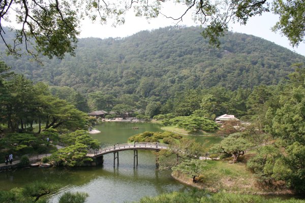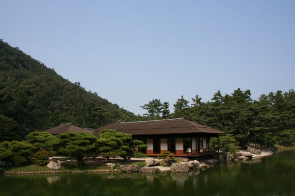 流石に日本中に名前が知られている名園だけあって、素晴らしい景観でした。奥の紫雲山を借景にした栗林公園は、回遊式の庭園で、歩いて周りながら様々な角度からいろんな姿を見せてくれます。なんとも立派で美しい庭園に、少しだけ暑さを忘れました。 掬月亭。歴代藩主が愛用した茶室です。大正天皇が皇太子時代にここに6日間滞在されたそうです。その時に植樹した松の木が、今は大木になっていました。ここでお抹茶をいただけます。 公園内には、いくつか高台があって、見事な景色を臨むことができます。四季折々、美しい景観を見ることができるのでしょうね。 今日は、南側がちょっとガスっていました。 香川県の技工の実演販売が園内にある建物で開催されていました。これって常時開催かしら? 園内は、萩が見頃でした。萩って白以外に桃色もあるんですね。 ちょっとだけ紅葉始めた楓です。 園内の池には、錦鯉がたくさん泳いでました。