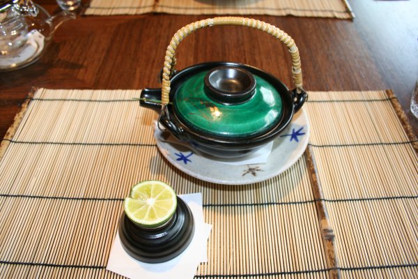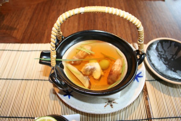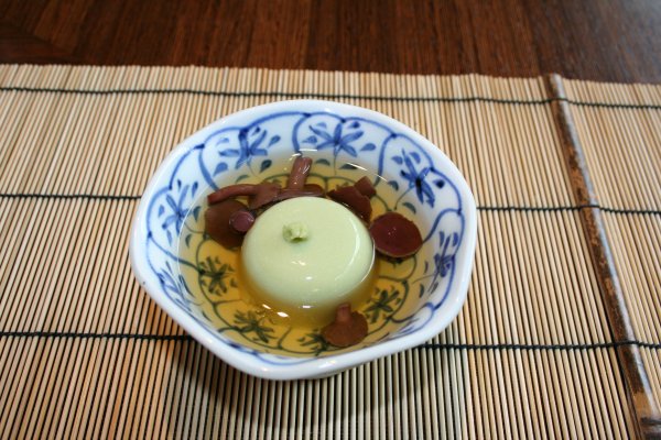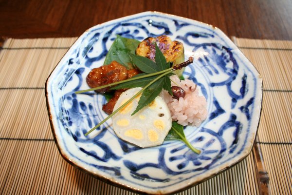 平日のお昼だけの彩り和み会席、6365円。安いなあ。お昼は、お得だ。 先付は、枝豆豆腐、網茸、風味出汁。枝豆豆腐は、美味しい。 前菜。穴子のお寿司が美味かった。 座付は、土瓶蒸し。酢立を添えて。 中は、松茸、銀杏、鯛。酢橘を搾るといっそう香り立ち、美味しい。 向附の旬のお造り、あしらい一式。お刺身は、鮪と鯛、それに湯葉。 炊合せは、白芋茎、落子芋、車麩、千石豆、桔梗人参。 焼物。長茄子田楽、辛し酢蓮根、合鴨ロース桑焼、萩飯蒸し。 合肴。胡麻豆腐野菜庵掛け、椎茸、湯葉、みつ葉。とろけた。美味しい。 雑炊。蟹、玉子、滑子、生姜。これも美味しい。 水菓子の季節のゼリー寄せ、梨入り。 |