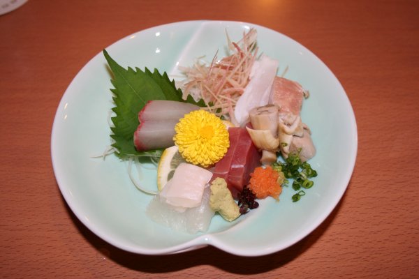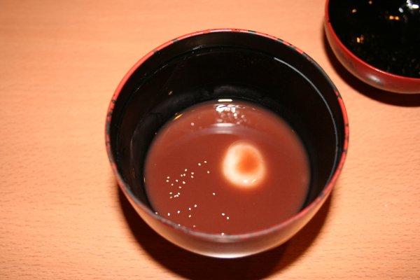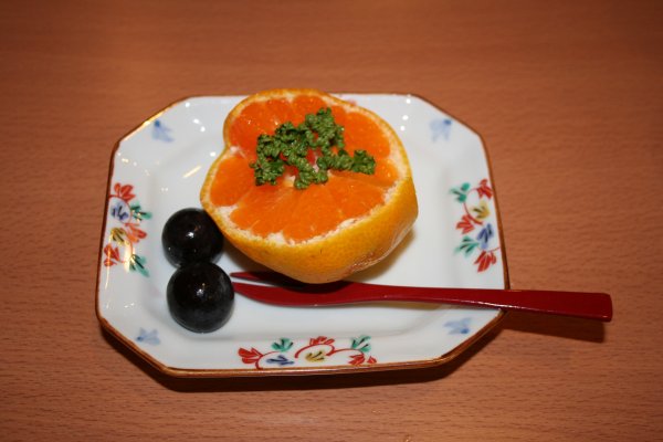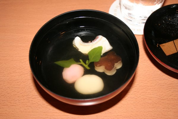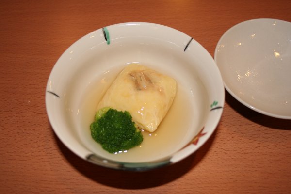 本当は、大皿に持ったのを、めいめいに取って食べるのだが、一人用にも懐石風に出してくれる。 そして、一番の特徴が、「おひれ」と言われる吸物から始まるところ。「おひれを召し上がれ」と言われて、はじめて食べることができる、それが卓袱料理だ。こうしたしきたりがとても興味深い。「おひれ」には、必ず鯛のひれ(又は身)が入っていて、お客様一人一人に鯛を使いましたという大歓迎の意味が込められているとか。 造里。あら、あらまき貝など、珍しいものが多かった。左半分は、刺身醤油で、右半分は、酢の物になっていてポン酢でいただく。 これが、メインの皿。揚げものの横には、卓袱料理らしい「豚の角煮」が、これがまた美味しい。 鰻の真丈。出汁が美味しかった。 御飯と香の物と赤出汁。これは、普通の懐石と同じだな。 デザート 「おひれ」で始まる卓袱料理は、「梅椀」で終わる。デザートの後にもう一つ椀が出てきて、開けたらお汁粉だった。面白いなあ。 |