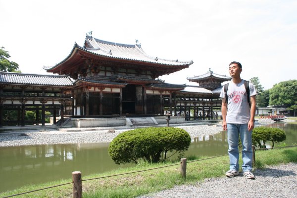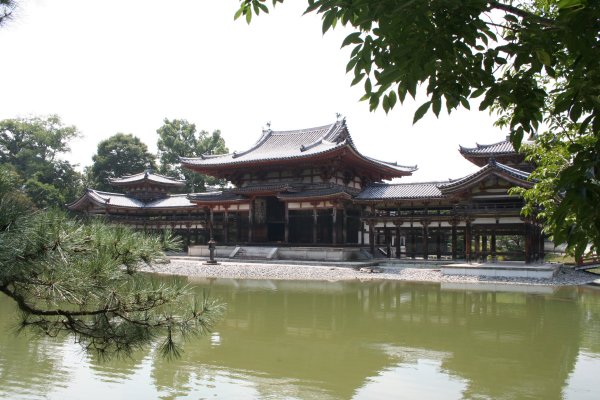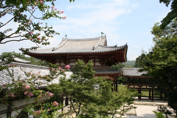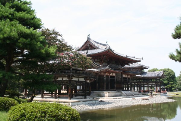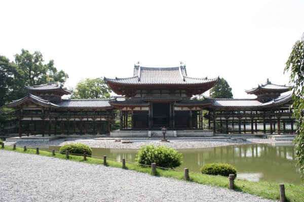 10円玉で同じみの鳳凰堂です。藤原頼通が、父道長の別荘を寺にしたものです。鳳凰堂として有名なこのお堂は、もともとは阿弥陀堂で、鳳凰堂と呼ばれるように なったのは、江戸時代からだそうです。他の伽藍が兵火などで皆焼失したのに、このお堂だけ奇跡的に残りました。藤原時代の貴重な遺構ですね。日本で最も絵 になる建造物の一つですね。大好きな土門拳も、もちろんこの写真撮ってます。 池の中島に建つこの堂は、鳳凰が翼を広げた姿に見えるから、屋根に番いの鳳凰がいることから、鳳凰堂といつしか呼ばれるようになったそうです。古の日本人の極楽浄土のイメージを具現化したものですね。 堂内には、国宝の阿弥陀如来坐像が 安置されています。2日前まで修復中で、中に入れませんでしたが、9月1日より、また中に入れるようになりました。ただ、阿弥陀如来の光背と天蓋は、代わ りに修復に入り、もとの姿を拝めるのは、2年後です。それでも、お堂の中は、色は褪せているものの、ところどころ残る美しい絵やこれまた国宝の雲中供養菩 薩に圧倒されます。雲中供養菩薩は、雲に乗って楽器を奏でる菩薩像群で、全部で52体あります。半分は、この本堂で、もう半分は、隣接する美術館で見るこ とできます。その美しさは、見ているだけで引き込まれ、また音楽の調べが聴こえてくるようです。 いろんな角度から見てみました。 後ろから見た鳳凰堂です。 |