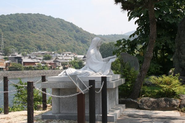 京都から宇治へ。今日も暑い。汗はダクダク止まらず倒れそうになりながらも旅は、続く。 宇治は、「源氏物語」の「宇治十帖」で有名な場所。「宇治十帖」は、光源氏の子である薫の物語。この最後の十帖の巻名の案内板が縁の場所にあって、散策が楽しい。(暑くなければだが・・・) 宇治川のほとりにある紫式部の像。言わずと知れた「源氏物語」の作者だが、生没年も本名も分かっていない。昔は、女性で名前を残すのは難しかったようだ。父親は、藤原為時なので、藤原氏には間違いないのだが、道長の系列じゃないとダメだったのかねえ。 紫式部の紫は、「源氏物語」の登場人物紫の上に由来しているらしく、式部は、中宮彰子に仕えた時の役職名。 歴史ある場所の散策は、本当に楽しい。古の人が何を想いこの川の流れを見ていたのか。なんて、考えながら歩いてみた。 |