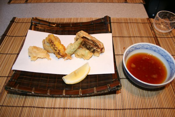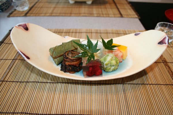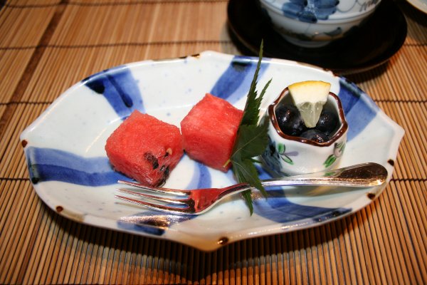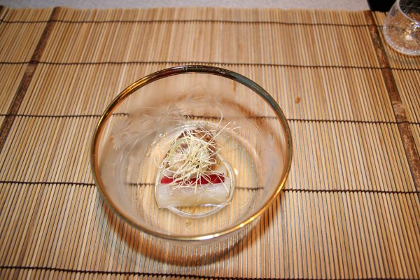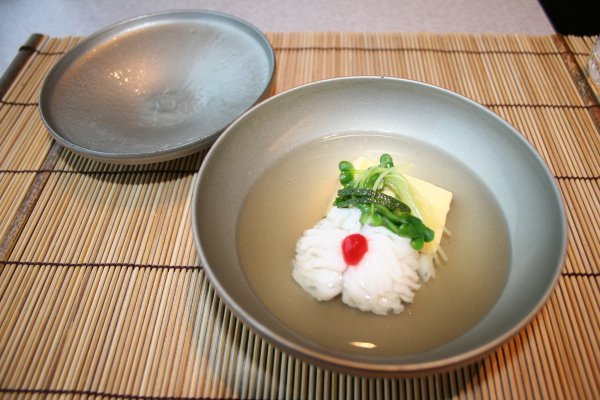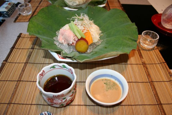 で、夜は、またお気に入りの雲海へ。今月は、東京、米子とここ大阪と3店目。 まずは、前菜。柿の葉寿司、鱧の子(ふり柚子)、海老しば煮、枝豆丸、レーズン松風、八幡巻、山桃ワインゼリー寄せ。 吸物。鱧葛打ち(玉子豆腐、かいわれ菜、柚子) 造り。生まぐろ、鯛、あしらい一式。 冷し鉢。 冷しゃぶ、稲庭細うどん、丸十、南京、はす芋、打明姜、大葉、葱、セロリ、胡麻だれ。 焼物。すずきたで焼。万願寺、金山寺みそ、はじかみ。 揚物。加茂茄子、穴子、はさみ揚、小芋、蓮根、おくら、レモン、天出汁。 酢物。白すいき、鯵胡瓜巻、利久麩、針白板昆布、土佐酢。 留椀。新生姜ご飯、香の物、赤だし汁。 果物。ブルーベリー、西瓜。 |