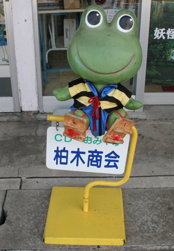 薬局のカエルも鬼太郎のちゃんちゃんこを着て、下駄を履いてる。