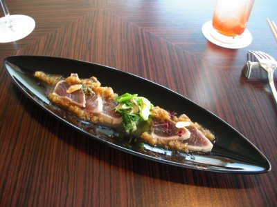 トロカツオのタタキのカルパッチョ 玉葱とほのかなにんにく風味ソース