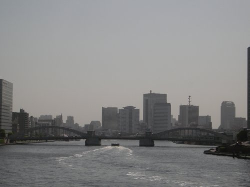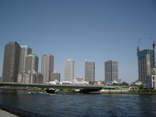 隅田川にかかる佃大橋から眺めた勝鬨橋です。夜は、緑色のイルミネーションで輝きます。遊覧船が沢山通るのを、上から見おろせます。