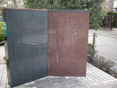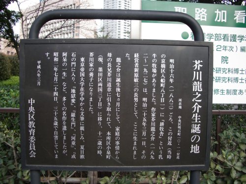 手前の小さな赤い屋根の建物は、創設者トイスラーの記念館。昭和八年の建設だが、平成十年に移築復元された。聖路加国際病院がある場所に、芥川龍之介の生まれた家があったらしい。この看板を読むと、生後七ヶ月で本所(現・両国)に移されたらしいので、本当に生まれただけだね。 そして、芥川が生まれた家があったところは、江戸時代は、忠臣蔵で有名な浅野内匠頭の屋敷があったところでもあった。なんか、すごい土地だなあ。でも、あるのは、この碑だけ。 |