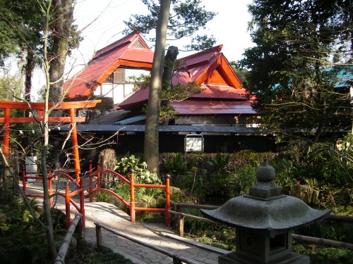神社と調和する美しい屋根の民家。