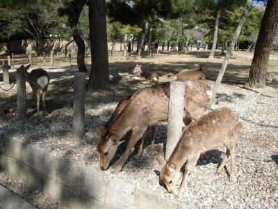奈良公園の鹿です。お店で鹿煎餅を売っているので、家族連れがそれを買って鹿にあげていました。しかし、大きな鹿が男の子の持った鹿煎餅目掛けてやってきました。怖くなったその男の子は、あわてて鹿煎餅を自分で食べていました。お母さんに「あんた、なに食っているのよー」と怒られていました。可愛い。