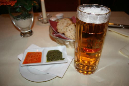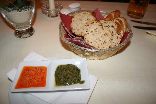 夜は、フランクフルトのホテルのレストランへ。パンと一緒に出てきたのは、アミューズのソース。これがアミューズなのか。まあ、いいや。左のは、tikka-masalaでちょっとカレー風味、右のは、arugula-olive。どちらにパンとよく合う。