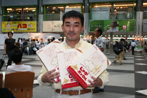 あきらめかけていた頃、千歳空港の三越売店に何やら行列が・・・。迷わず並んで、ついに手に入れることができた。じゃがポックル入手! 今回の旅行で一番嬉しかったりして・・・。 空港の売店もあちこち探し周ったけど、三越の売店では朝と昼と夕方に分けてその日の入荷分を販売しているみたい。たまたまそのタイミングに並ぶことができてラッキーだったみたい。ただ、ものの10分ほどで完売。並んだのに買えない人がたくさんいた。 |