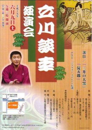 松幸 「饅頭怖い」 すごーく久しぶりにこの噺を聴いた。「寿限無」とかこの噺とか、落語を知らない人でも知っているこれらの噺、僕は、何故か高座ではあまり遭遇しないなあ。笑顔で明るく演じられてたな。 吉幸 「権助魚」 つ、ついに7月1日に二つ目昇進が内定したそうだ。早く来い、来い7月1日、談志師匠の心変わりがないうちに・・・。 吉幸さんの「権助魚」は、何度も聴いているのに、笑ってしまうなあ。もう完全に自分の噺になっているね。 談幸 「三井の大黒」 談幸師匠、優しいお顔だけど、まくらは、かなりブラック。強烈な皮肉とブラック・ユーモアは、抱腹絶倒だ。 今 日は、「三井の大黒」かあ、ちょっと飽きたなあと思っていたが、噺が始まるやすぐにひきこまれた。ユーモア溢れ不思議な魅力たっぷりの甚五郎と短気な江戸 の大工とのやり取りが最高に可笑しい。時折挿入される小話も最高、サゲに挿入された三井記念美術館の小話は、意表つかれた、爆笑! ストレート松浦 ジャグリング 毎回、多彩なゲストが登場するのもこの会の楽しみの一つ。本当にバラエティーに富んだセレクションに、いつも感心してしまう。 今回は、ジャグリング。最前列で観てたので、ちょっと怖かった。今日は、2回ほど失敗して物が飛んで来たし・・・。(笑) でも、簡単そうに見えてすごい技なんだろうな。汗の飛び散りも半端じゃなかった。ものすごい体力とプレッシャーなんだろう。 談幸 「淀五郎」 最近は、歌舞伎も観るようになったので、こうした噺がより楽しめるようになった。歌舞伎を観に行った時は、逆に、あ、これあの落語のシーンだなとか、相互に楽しめる。 談幸師匠、袴で登場。芸に命かける役者の噺で、芯にあるのは真面目な噺なのだが、ところどころにぐさりぐさりと刃物でさすように笑いを入れる。 淀五郎に感情移入してしまって、由良之助を刺し殺しちゃえと思ってしまった。(笑) |