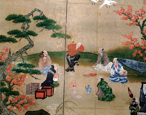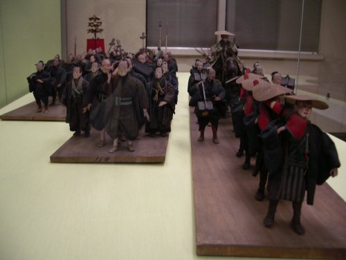 2階国宝室は、11月19日(日)まで「観楓図屏風」が展示中。京都の人々が紅葉を愛でている日常が生き生きと描かれている。美しい色、飛ぶ鳥の優雅さ、楽しげな人々の当時の風俗がとても興味深い。 観楓図屏風 紙本着色 狩野秀頼筆 室町時代 国宝 賑わいの声、自然の音、静けさが伝わってくるようだ。絵巻の流れを負っていくと、都会から田舎へと散歩している気分。 何気なく窓から外を物憂げに観ている老婆、戯れている子供、碁を打つ人、とにかく細かくて、各家々を覗いている気分が楽しい。 昭和20年代末から30年代にかけて国によって工芸技術の記録保存が行われた。それによって作られた工程見本などを手がかりとして陶磁、漆工、金工などのさまざまな分野の伝統の技を展示していた。 九谷焼技術記録、螺鈿技術記録に見入ってしまった。日本の伝統技術ってすごい。圧倒された。こういう展示も面白いな。 常設展示もものすごく充実していて、学芸員の方の企画力が素晴らしいのだろうな。 単に並べるだけじゃなく、見せ方が本当に凝っている。 特集陳列 旅と街道(本館16室 ~2006年12月17日(日))にも狂気乱舞。細かいところまで正確に作られた大名行列人形にはびっくりした。