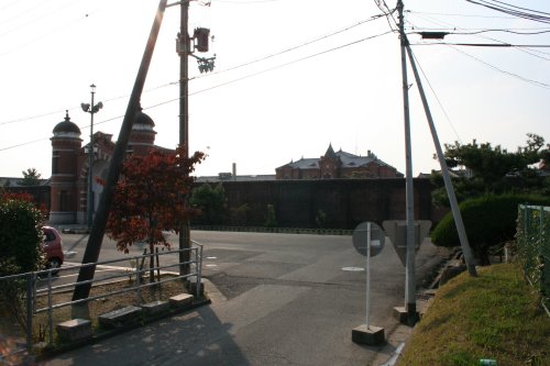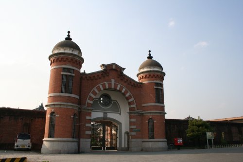 般若寺へ向かう途中の小道、ふと横を見ると何やら遠くに素敵な煉瓦建築の面影が・・・。も、もしかてこれが奈良ドリームランドかしらなんて思いながら、ルンルン気分で向かってみると、「奈良少年刑務所」だった。 しかし、なんとも煉瓦マニアの心を鷲づかみにする門なのだろう。こんな刑務所なら何とかして入所したいもの、なんて不謹慎な考えが一瞬よぎるが、そうだ僕は、もう少年ではなかった・・・。 |